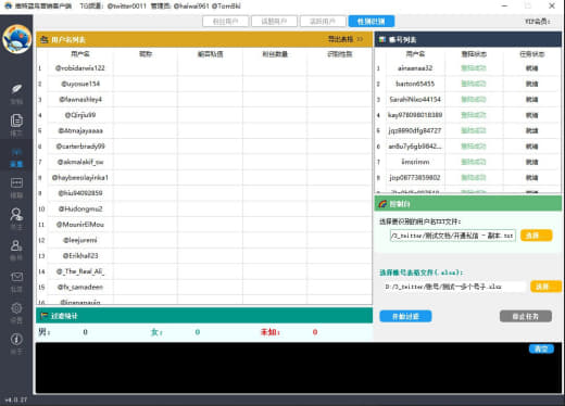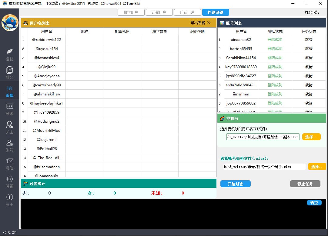 3.协议采集开通私信的用户+性别识别+多国语言识别采集